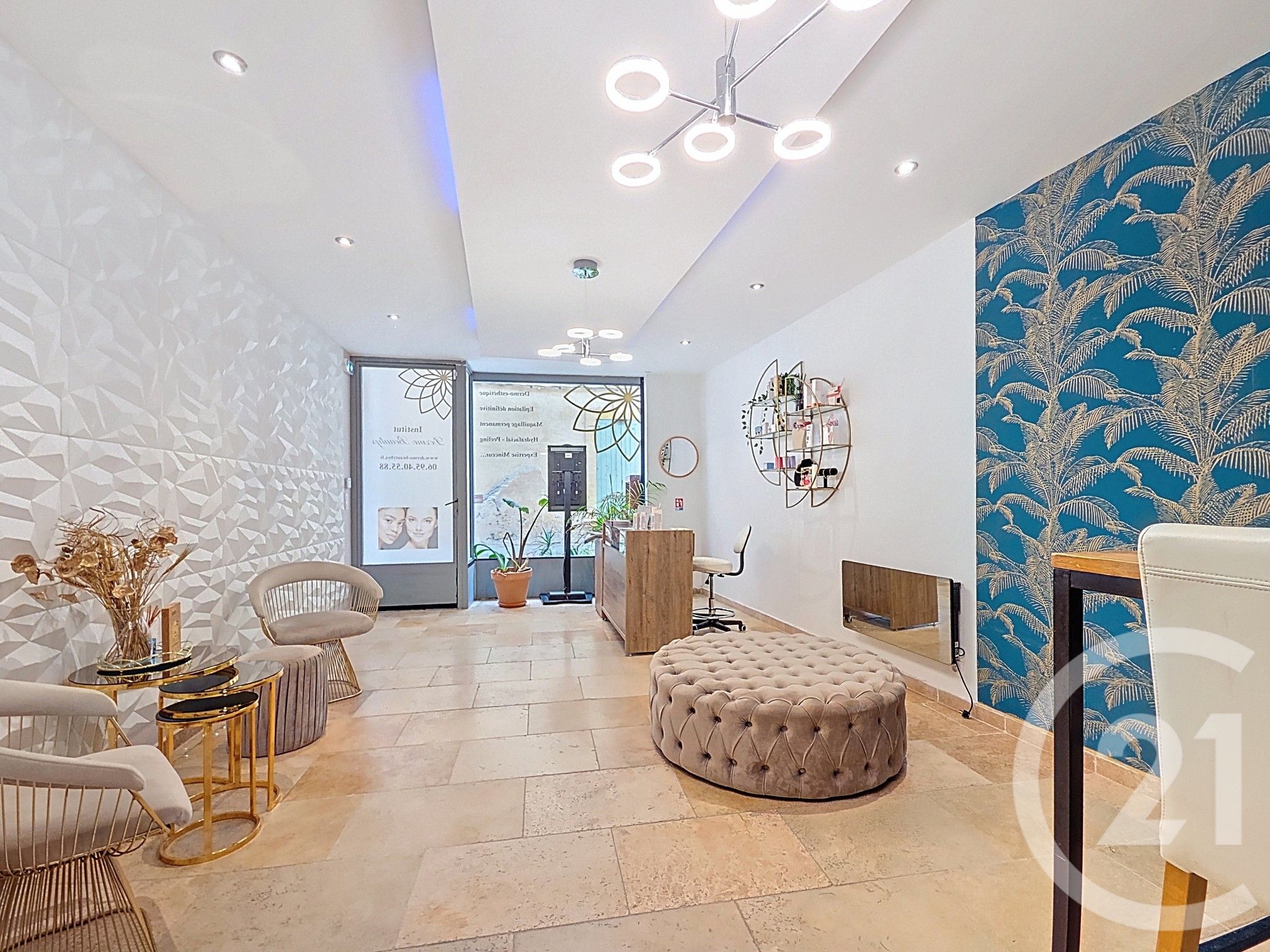 - Un local commercial de 63 m², situé en rez-de-chaussée avec sa propre entrée. Il dispose d'une salle d'attente pour accueillir la clientèle, une salle d'eau avec douche italienne et WC, suivi de deux cabines de soins.